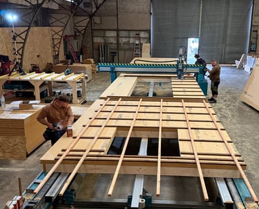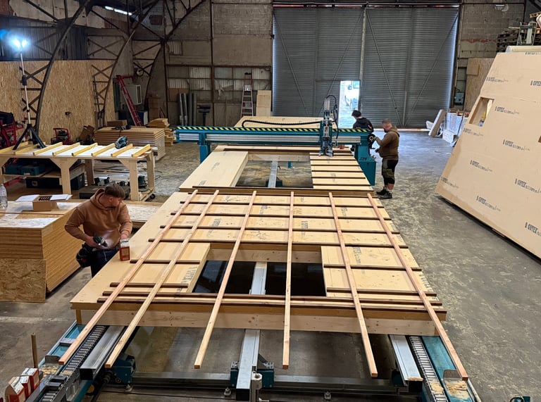Nous mettons notre atelier à disposition des charpentiers, menuisiers et maîtres d’œuvre. Nos équipes taillent et assemblent vos panneaux sur mesure selon vos plans, avec une grande précision.